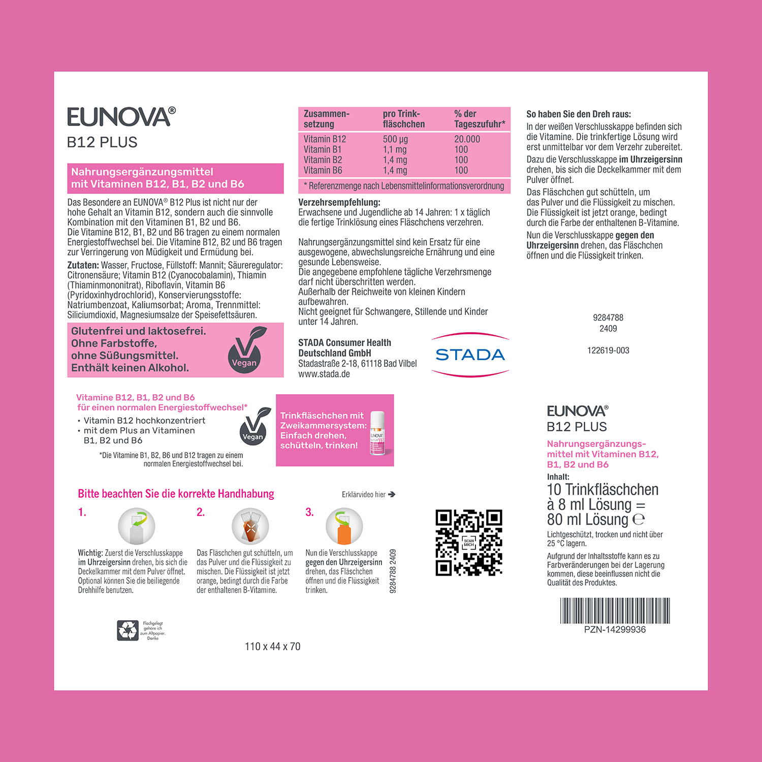 EUNOVA® B12 Plus gibt es im praktischen Trinkfläschchen mit Zweikammersystem: Die Vitamine B12, B1 und B2 befinden sich in einer separaten Schutzkammer in der Verschlusskappe. Sie werden erst unmittelbar vor der Anwendung in Lösung gebracht – durch Drehen der Verschlusskappe im Uhrzeigersinn.